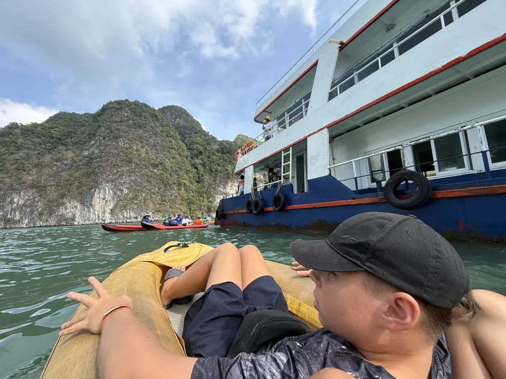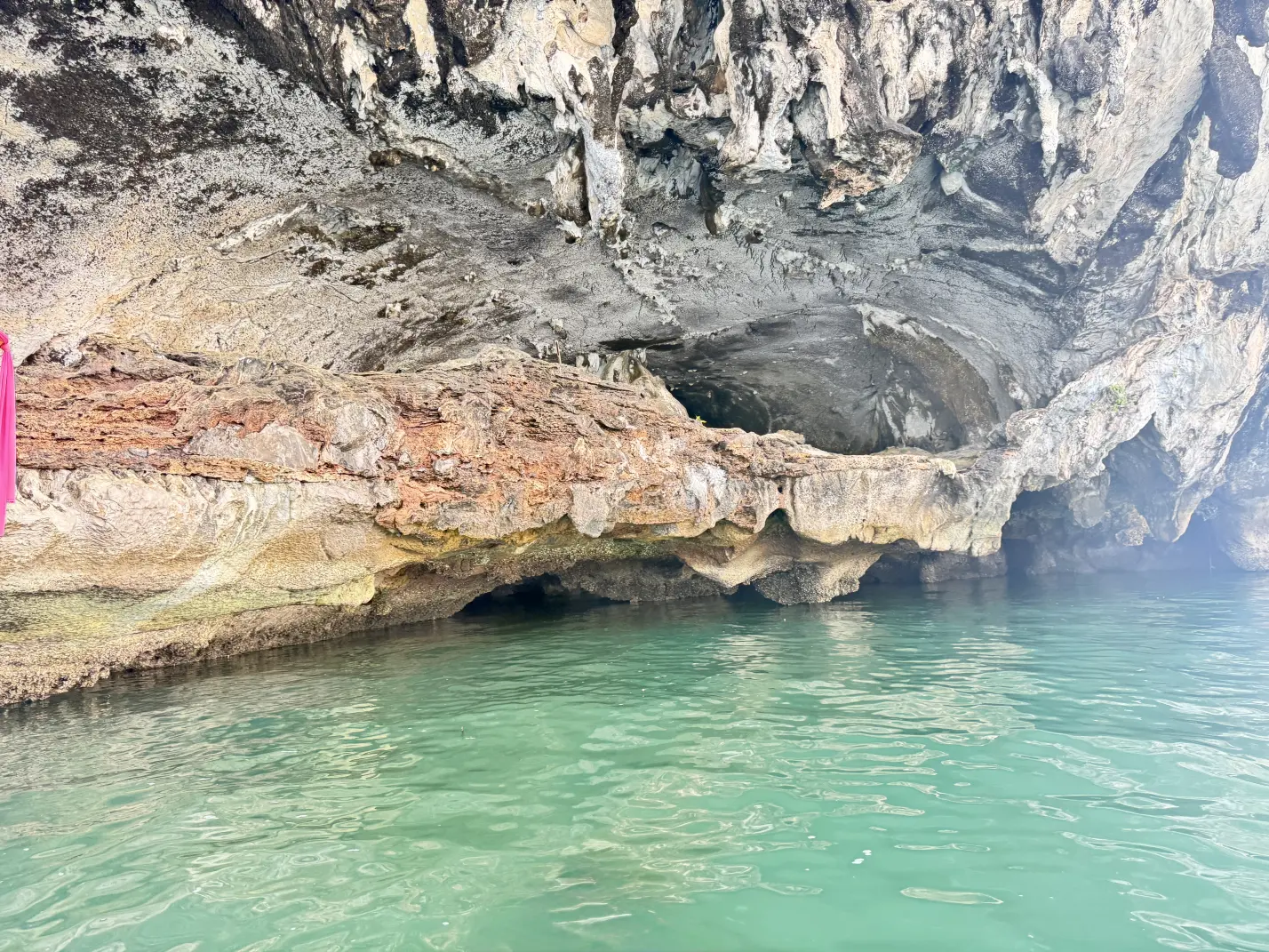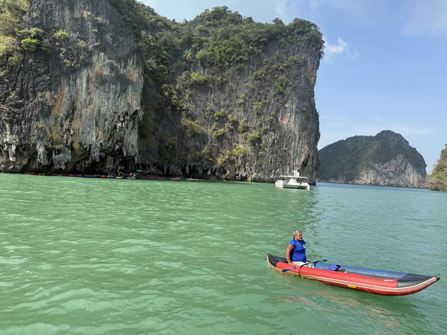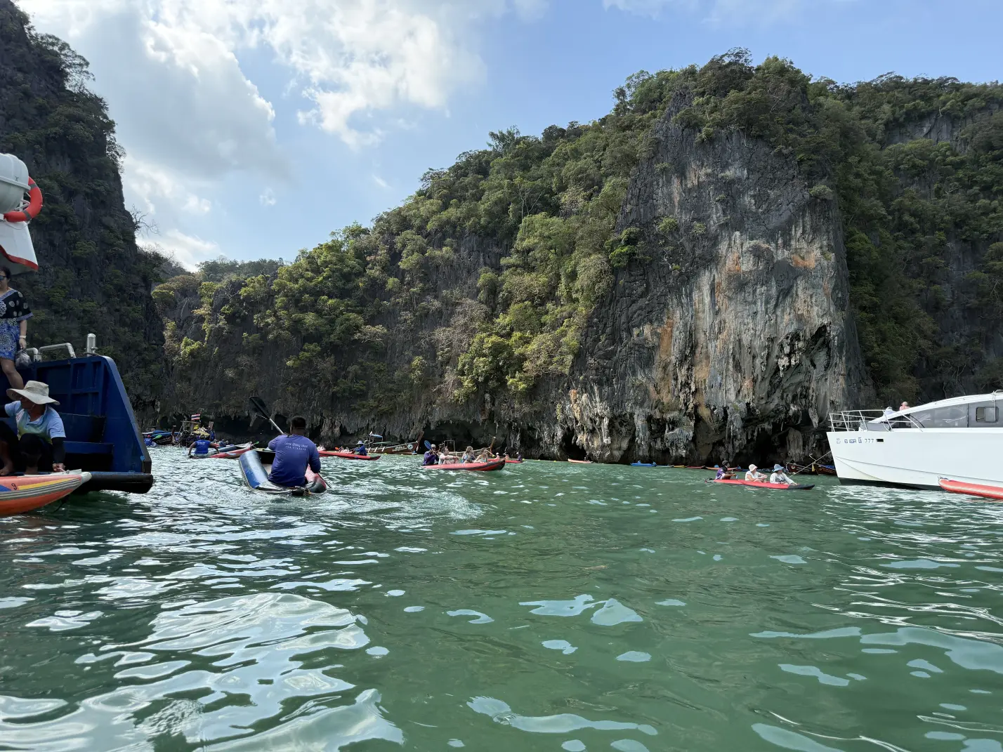 Nasza przygoda zaczęła się między 8:30 a 8:45, kiedy odebrano nas z hotelu i przetransportowano do przystani Ao Por. Już o 10:00 byliśmy na miejscu, gotowi na rejs po jednym z najpiękniejszych zakątków Tajlandii.  Statek ma kilka pięter, z toaletami i małym barem. Pierwszym przystankiem była Wyspa Hong – to tutaj przesiedliśmy się na kajaki, by wpłynąć do samego serca skalnej wyspy. Widoki pionowych ścian wyrastających prosto z turkusowej wody robią niesamowite wrażenie!
